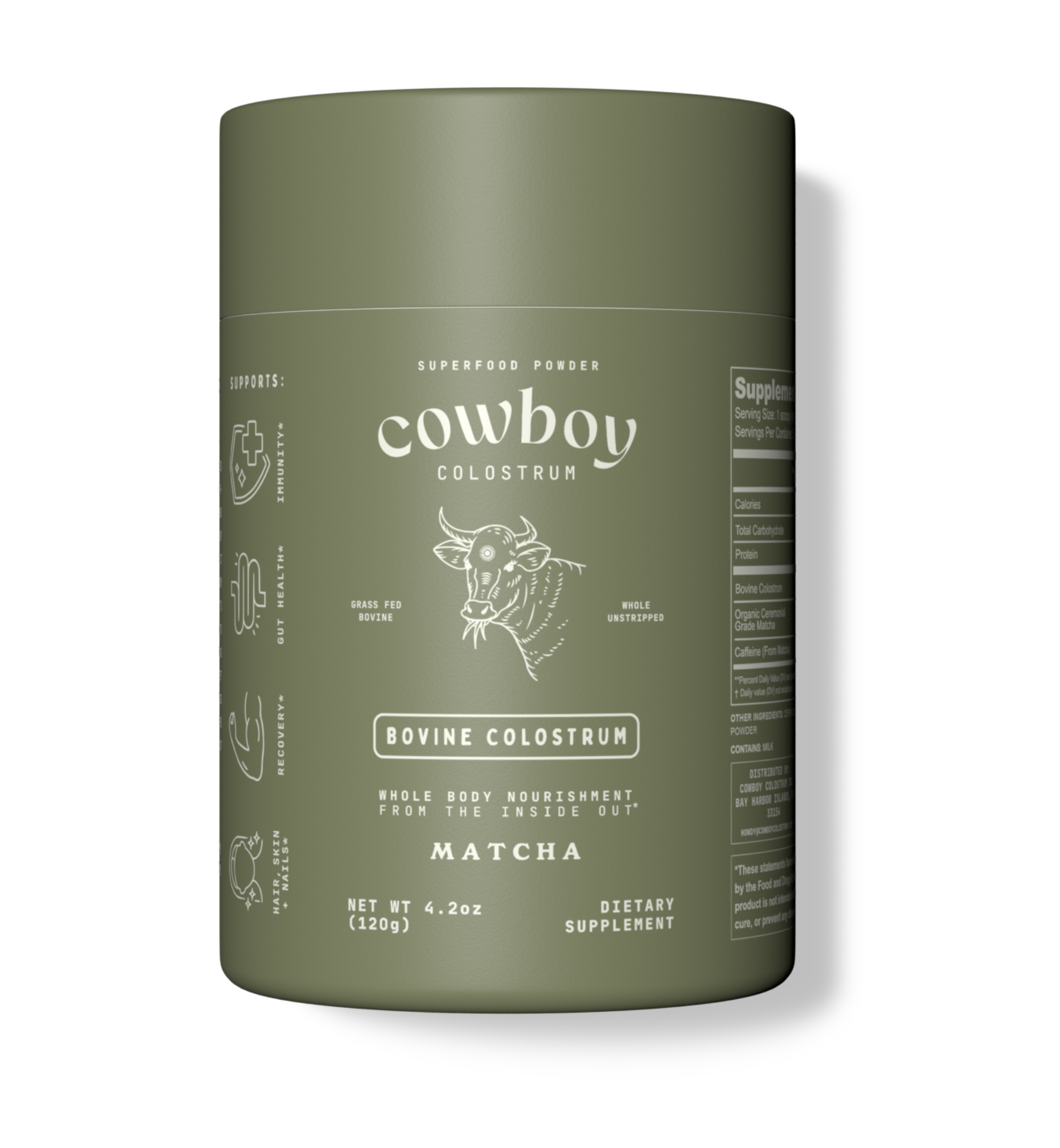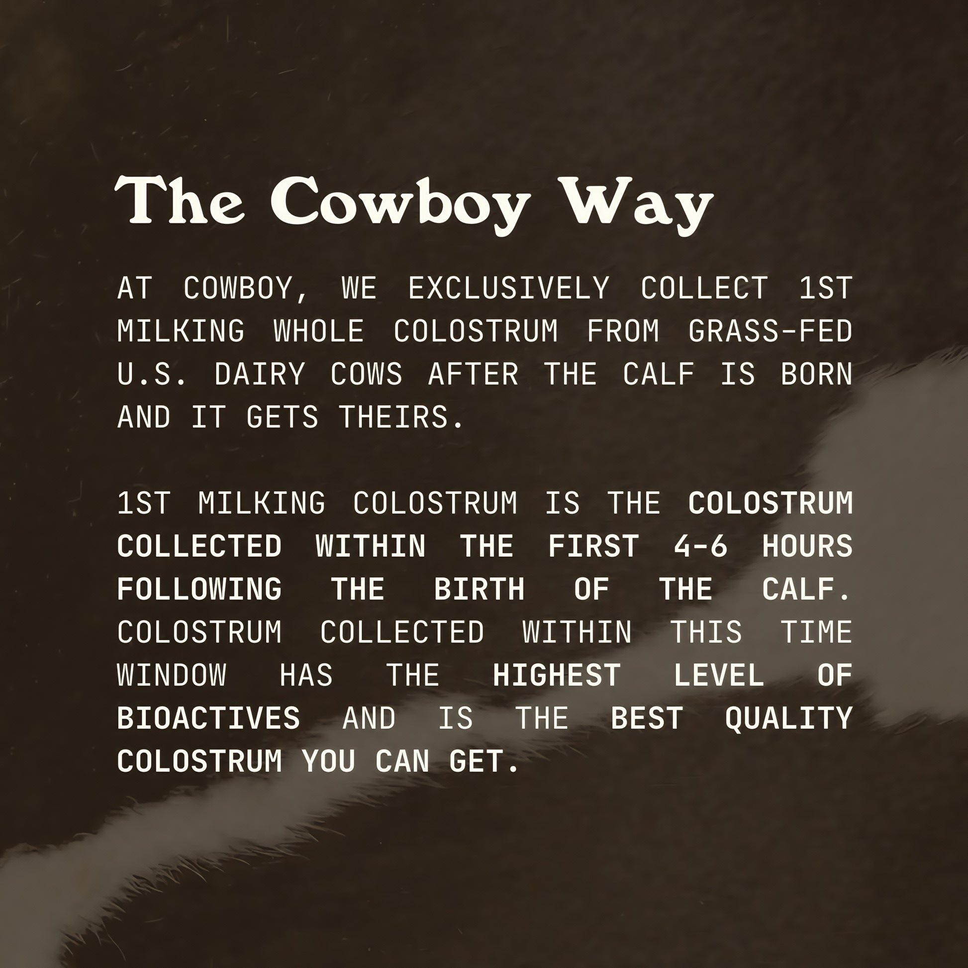 Cowboy Colostrum is ethically sourced-calves always feed first.0ur grass-fed cows are never given rBST,antibiotics,or hormones,ensuring sustainability & animal welfare.