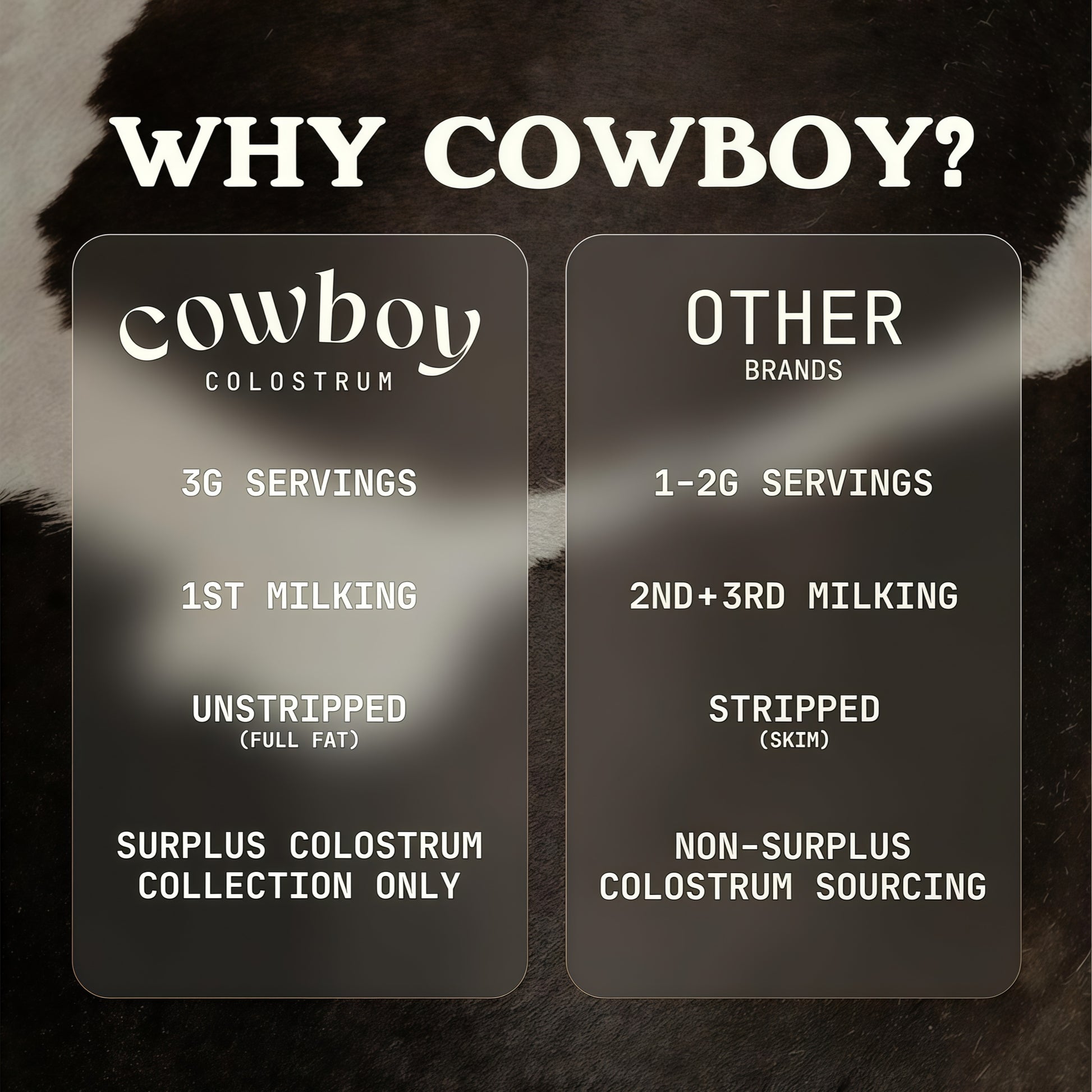 Cowboy Colostrum only sources first-day colostrum - collected within 24 hours after every calf is nourished - to preserve maximum bioactive potency. Our colostrum stays unstripped, whole, and as close to nature as possible. Unlike many brands that skim or strip fat, Cowboy keeps colostrum in its whole, full-fat form, maintaining all naturally occurring nutrients, peptides, and immune factors for optimal efficacy. Each serving delivers a robust 3 g dose - higher than most competitors - and comes in delicious, easy-to-mix flavors like vanilla, cacao, and unflavored.